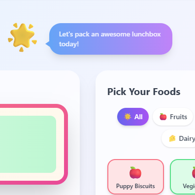 Pickly Lunch Buddies empowers children to explore foods, rate favorites, and create lunchboxes with ease, while guiding parents with customizable nutrition goals and meal planning features.